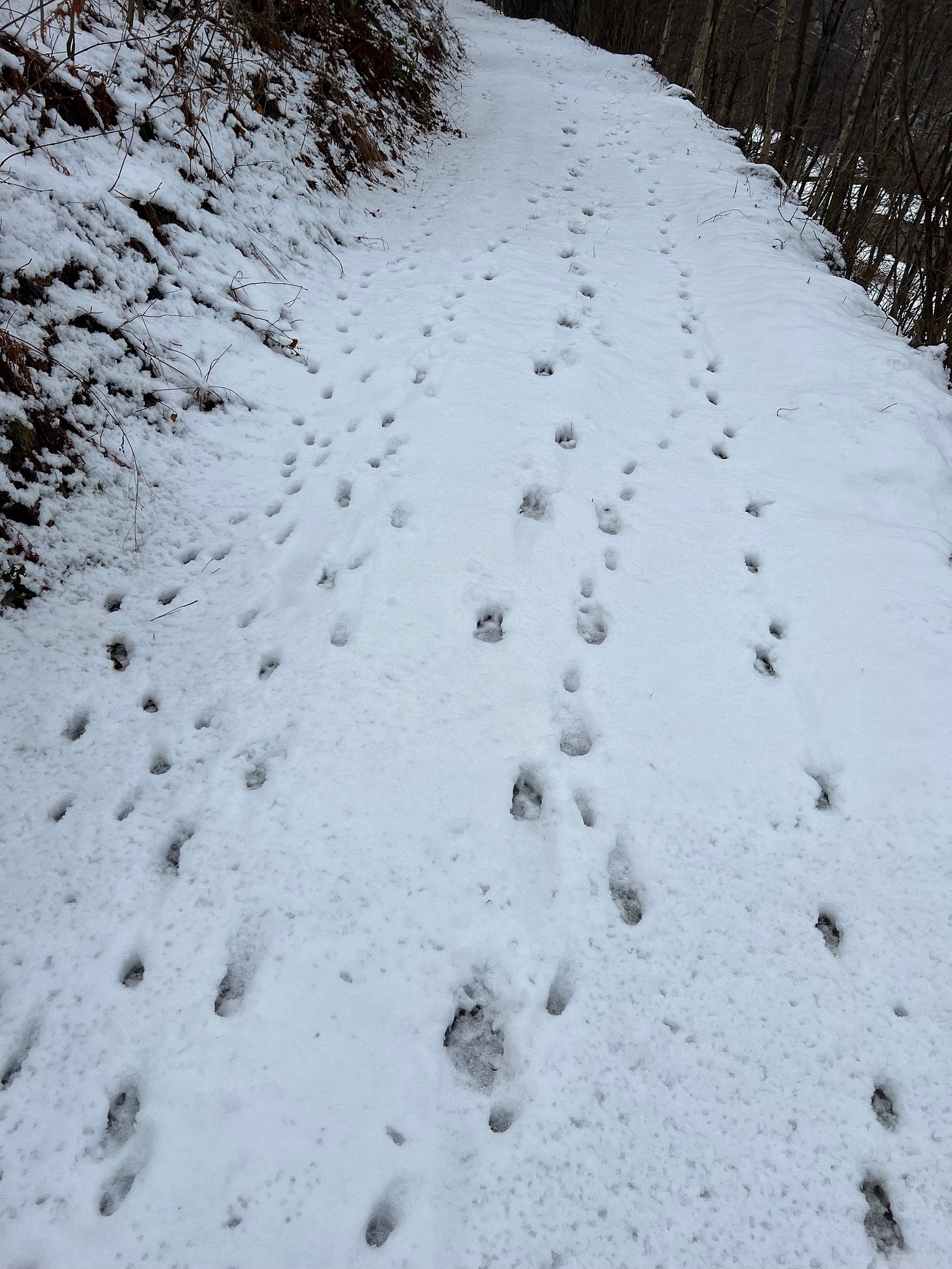 The Mountain was lyrically beautiful in its deep winter landscape of skeletal trees and undulating snow-drifted meadows, mist hanging in dense white pockets, hugging low corners of the valley. To the west, the upper peaks had all but disappeared from view, the snow melding the sky and Mountain into one vast, breathing Winter body, reclining peacefully in slumber. Vehicle tracks, footpaths, streams and waterfalls traced out the Mountain’s venous system in a creeping network of white lines, I had slipped and skidded along one such frosty artery to reach the fontana that morning, struggling to find purchase in the wet snow. Forced to slow my pace and watch the ground, I noticed the delicate capillary network of animal tracks fanning out along the path and slopes, clearly delineating the wildlife corridors normally invisible to all but the practised human eye. Wolves, deer, hares, foxes and feral cats had all passed this way since last night; I traced the meandering lines with my eyes, noticing where a hare had paused to rest, and a fox had turned suddenly on its heels, disappearing back into the woods. The wolf tracks ranged out in a ragged line across the meadow, detailing the movement of a family group emerging from the upper wood line and heading towards the valley basin. The wolves were probably following the scent of my neighbour’s sheep, although the small flock were tucked up in a barn at this time of year and protected by a Maremmano, an Italian breed of livestock guardian dog. Turning around and looking back at my footprints mingling with those of my creaturely neighbours, I reflected on the simple purity of a moment like this on a Monday morning in January, feeling a rush of gratitude for this starkly basic life. As many would be on public transport heading to city jobs or navigating traffic jams driving their children to school, I bent down to examine an unfamiliar paw print among the others (possibly a type of Marten). A different kind of life, no better or worse than any other, but I feel no regret for the one I left behind.
